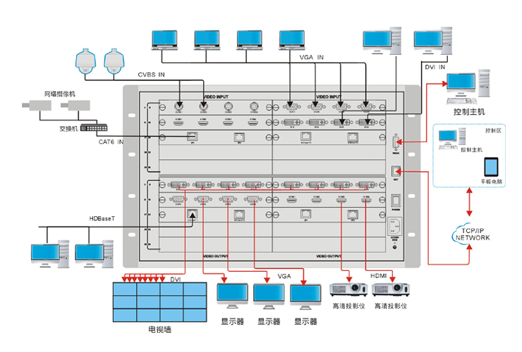 現代音視頻系統,常用的視頻設備包括高清模擬攝像機、高清數字攝像機、高清錄播機、藍光高清DVD、高清視頻會議終端、高清視頻矩陣、高清投影機、機頂盒、高清液晶電視、PC等;視頻接口類型涵蓋:AV、VGA、RGBHV、YPBPR、DVI、HDMI、HD-SDI等。數字混合矩陣具備模擬、數字、標清、高清混合接入能力是多功能會議廳、監控中心、交通監控、教育機構等應用場合的得力助手。