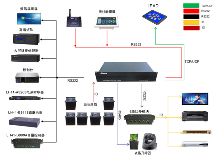 作為中樞設備,控制主機通過多協議接口(RS232/485、IR、網絡等)兼容投影儀、音響、燈光等設備,實現指令集中處理與分發。以LH61-B5100N為例,其搭載400MHz工業級ARM處理器,支持256個設備擴展,可滿足大型場景的復雜控制需求。