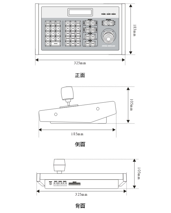液晶顯示屏實時顯示設備當前操作狀態,并能顯示監控系統中其他設備反饋的狀態信息,使操作方便直觀。鍵盤面板上共有39個按鍵,按鍵采用實鍵開關,確保操作自如、準確可靠。三維矢量搖桿輕松、靈活控制多種類型的智能高速球和中速球,通過搖桿能直接控制攝像機鏡頭變倍。鍵盤底部有3個數據通訊端口,每個數據通訊端口的用途和波特率可由用戶自行定義,用戶可以根據需要選擇RS-232/RS-485或RS-422通訊方式。