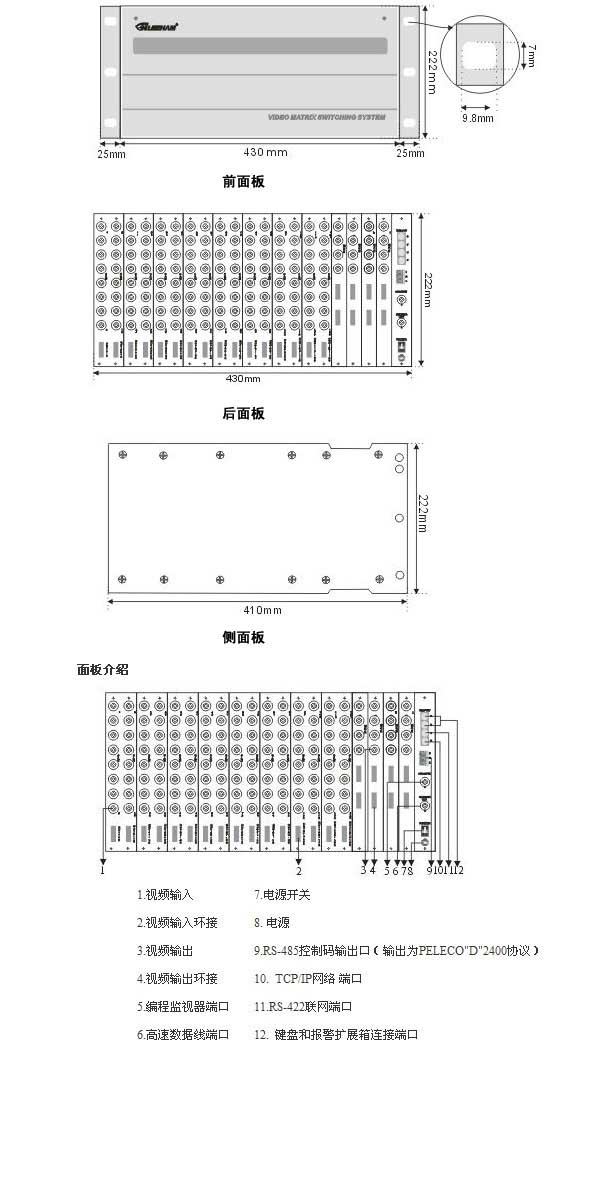 LH60-51R矩陣切換/控制系統后面板具有2個RS-485通訊端口,可連接控制鍵盤、報警接口箱、多媒體控制軟件等設備。1個RS-422聯網端口,用于多級聯網控制。1個以太網通訊端口,用于以太網聯網控制。1組PELCO“D”2400控制協議輸出,可控制高速球、解碼器或碼轉換器等設備。1個高速數據線端口,可直接連接控制碼發生/分配器等設備。1個編程監視器端口,通過專用編程監視器接口設置系統參數。