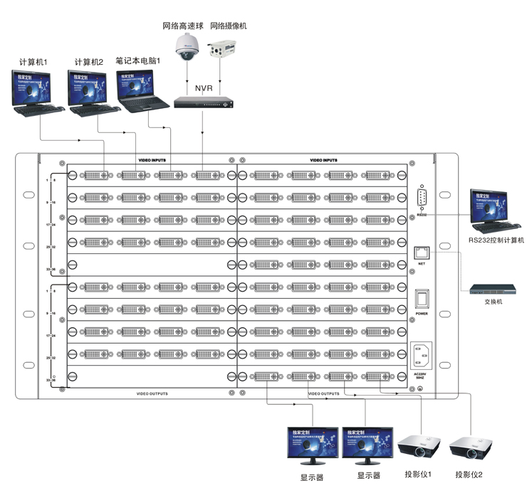 LH60-DVI32-12 | 32進12出高清DVI矩陣,6.5G帶寬,EDID處理,前面板帶LED液晶顯示通道切換信息。面板/紅外/RS-232控制。 |