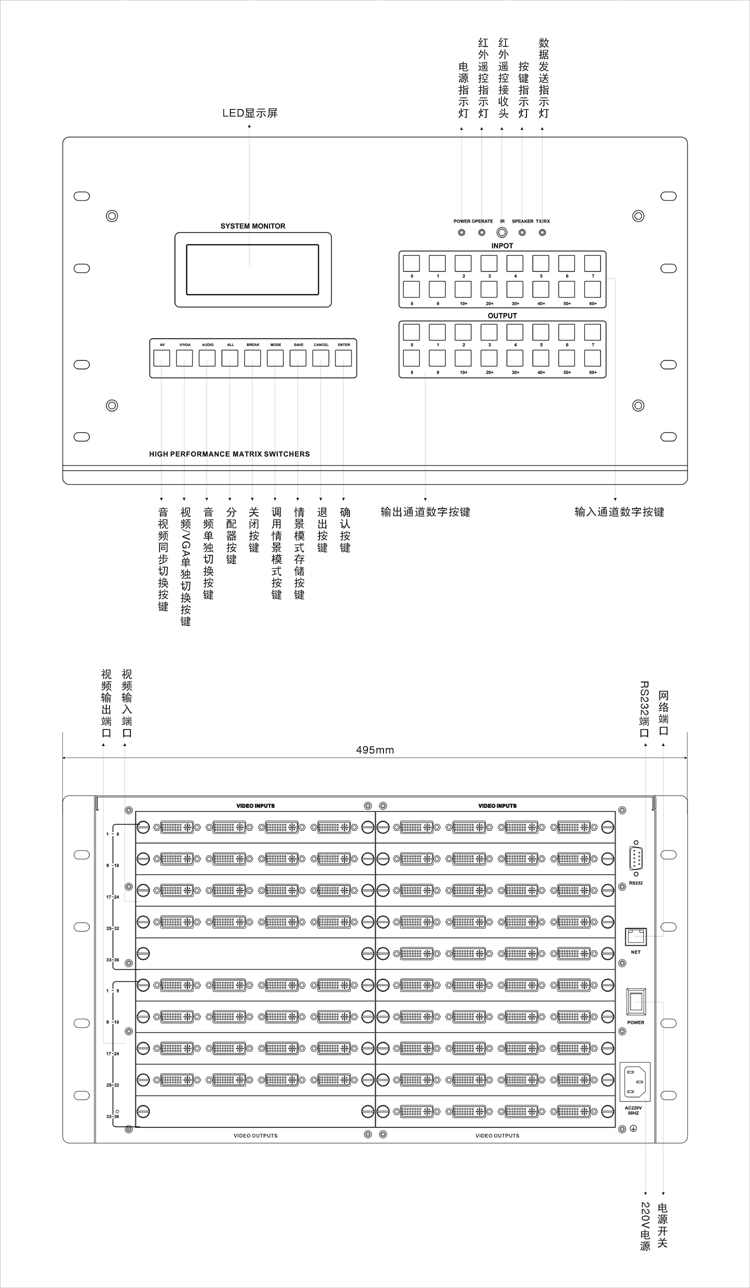 LH60-DVI36-32 | 36進32出高清DVI矩陣,6.5G帶寬,EDID處理,前面板帶LED液晶顯示通道切換信息。面板/紅外/RS-232控制。 |