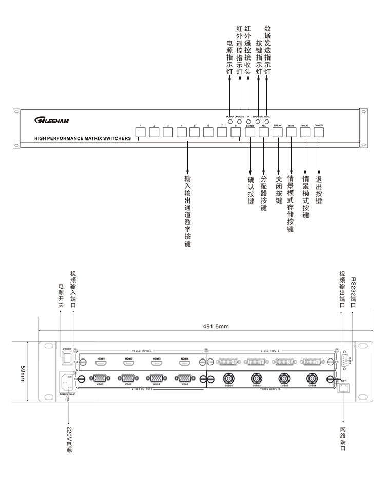 8進4出高清混合矩陣,1U機箱,含CPU控制模塊、電源模塊。(板卡自選) |