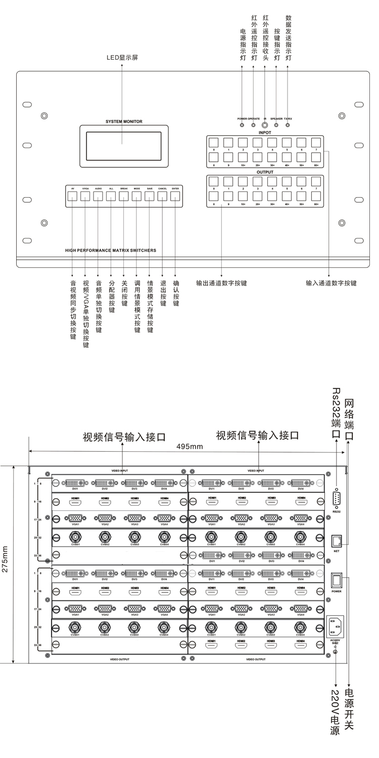 LH70-MT600 | 20進20出高清混合矩陣,6U機箱,含CPU控制模塊、電源模塊、切換模塊、面板鍵盤控制模塊。(板卡自選) |