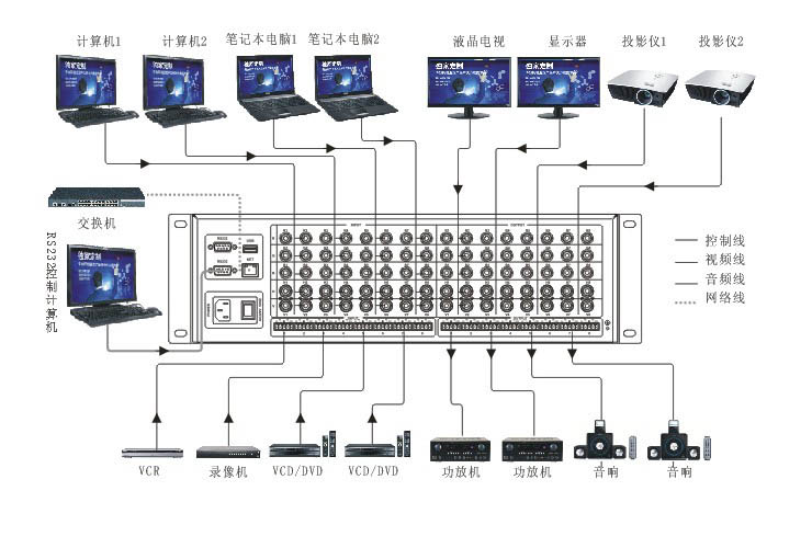 8進8出RGB矩陣,5BNC接口,750MHZ,面板/紅外/RS-232控制。 音頻非平衡立體聲,RCA接口。 |