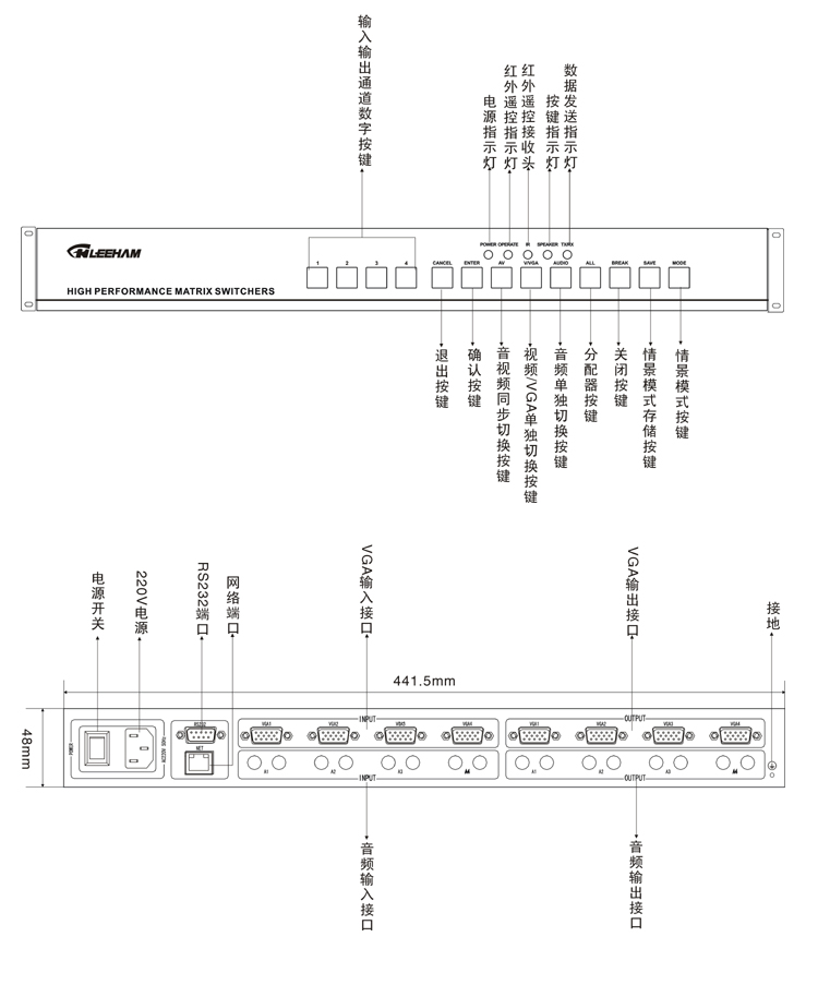 4進4出矩陣切換器,15HD母接口,350MHZ, 面板/RS-232控制/紅外遙控器。 音頻非平衡立體聲,3.5接口。 |