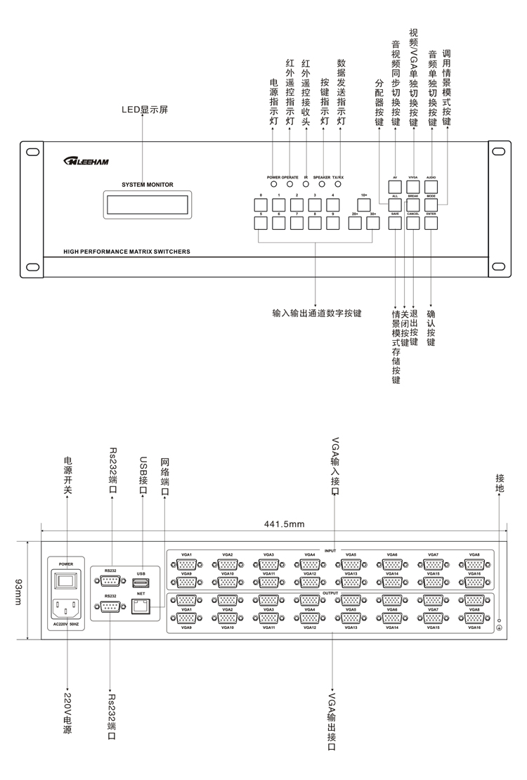 LH60-VGA16-16M | 16進16出矩陣切換器,15HD母接口,500MHZ, 面板/RS-232控制/紅外遙控器。 |
