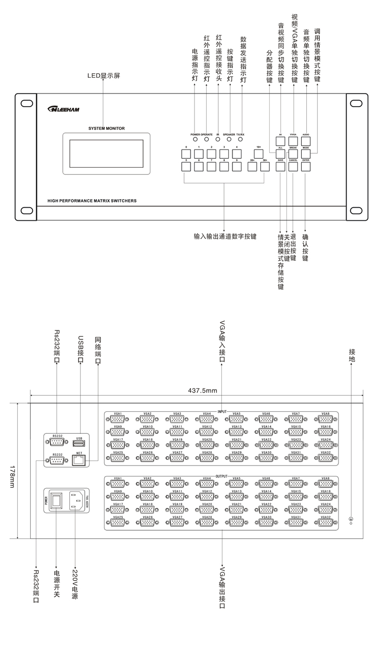 LH60-VGA32-32M | 32進32出矩陣切換器,15HD母接口,500MHZ, 面板/RS-232控制/紅外遙控器。 |